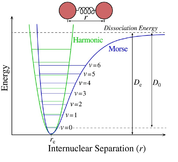 An elegant alternative is the calculation of vibrational wave functions by numerically solving the nuclear Schrödinger equation. One method to achieve this is a method according to Boris V. Numerov requiring the potential curve as input in form of a discretised grid. The latter can be obtained from a potential energy scan executed for instance using the QM program gaussian. The difference between the eigenvalue of the ground state (\(n=0\)) and the first (\(n=1\)) and second (\(n=2\)) excited states correspond to the expected vibrational frequency of the fundamental and first overtone, when divided by Planck’s constant: