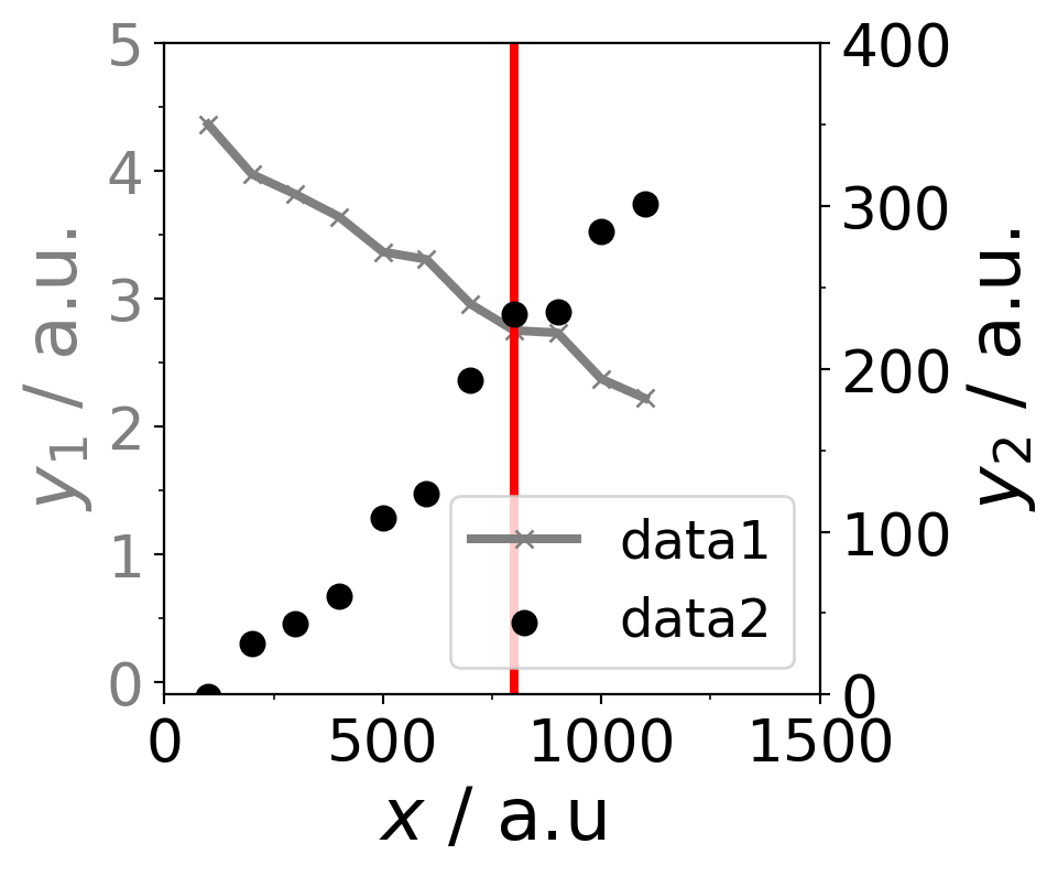 ax1.set_ylabel(r"$y_1$ / a.u.",color="grey") # define also the color of the labels